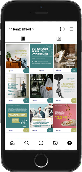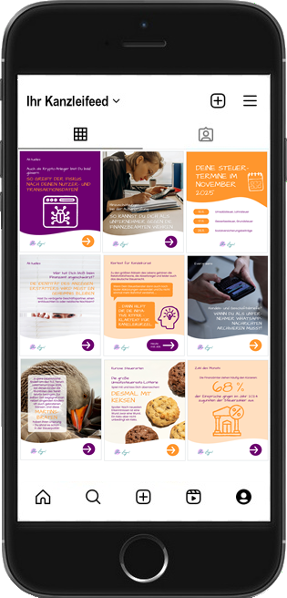 Der Post-Bote bringt Ihnen den perfekten Content-MixInstagram lebt von der hohen Frequenz an Veröffentlichungen, die nur eine sehr kurze Lebensdauer haben. Da ist es schwer, die Balance zwischen Kosten und Nutzen zu wahren. Damit Ihre Kanzlei in den sozialen Medien sichtbar wird, liefert Ihnen der Post-Bote eine Themenmischung, die auch führende Influencer erfolgreich macht: Educational Content 5 Posts mit praktischem Mehrwert, um Follower zu gewinnen, z.B. monatliche Steuertermine, Infografiken zu steuerlichen Evergreen-Themen und die Quintessenz der neuesten Gesetze als Karussell-Posts. Fun Content 5 Posts, um Ihre Follower zu unterhalten, z.B. eine Serie über die skurrilsten steuerlichen Fachbegriffe und Steuerarten, Fun Facts über den Fiskus und erstaunliche Statistiken zu Finanzthemen. Wenn Sie mögen, fügen Sie noch hier und da einige individuelle Posts mit Schnappschüssen aus Ihrem Kanzleialltag ein, damit sich Ihre Follower langfristig mit „Ihrer Marke“ identifizieren, und schon spielen Sie auf Instagram ganz vorne mit! | |