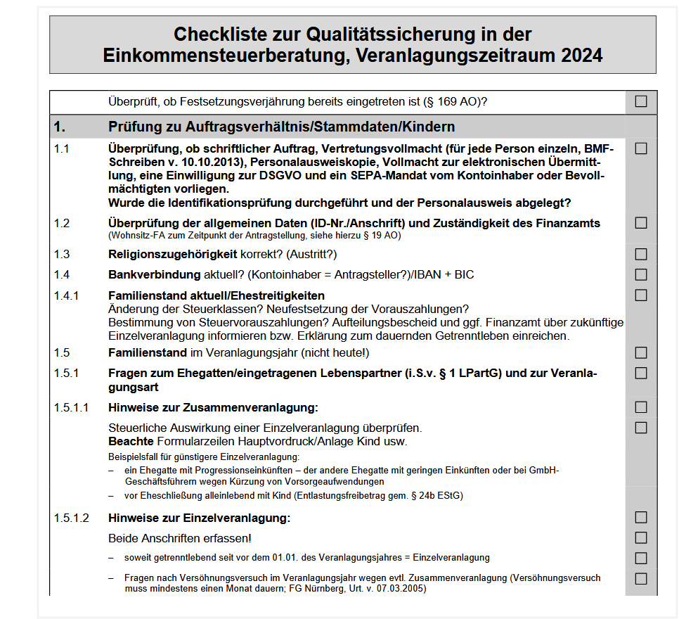 Unsere umfassende, 10-seitige Checkliste unterstützt Sie bei der Qualitätssicherung in der Einkommensteuerberatung. Sie und Ihre Mitarbeiter haken einfach alle Arbeits-, Beratungs- und Kontrollschritte ab – fertig!
