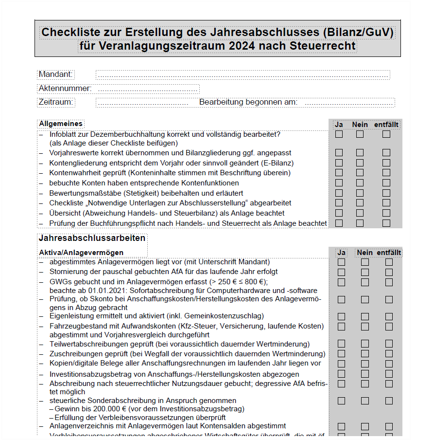 Nutzen auch Sie diesen Praxishelfer für Ihre Jahresabschlussarbeiten – laden Sie hier als PDF die komplette 5-seitige Checkliste Jahresabschluss VZ 2024 herunter!
