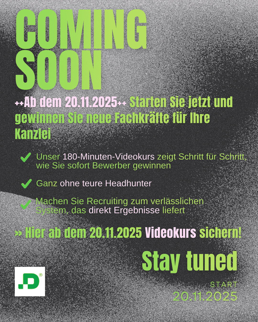 Ab dem 20.11.2025 hier Videokurs sichern und Recruiting zum wiederholbaren System in Ihrer Kanzlei machen.